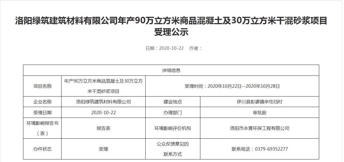 洛陽綠筑建筑材料有限公司年產(chǎn)90萬立方米商品混凝土及30萬立方米干混砂漿項(xiàng)目受理公示