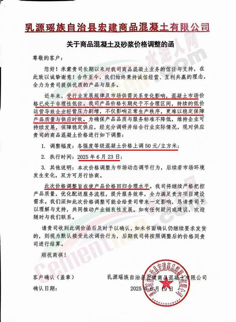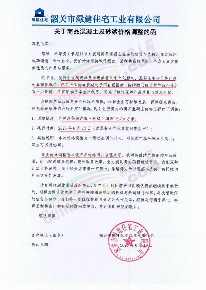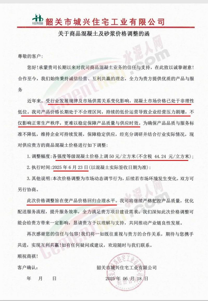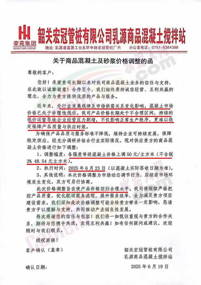 近日,乳源瑤族自治縣宏建商品混凝土有限公司、韶關(guān)市城興住宅工業(yè)有限公司、韶關(guān)市三創(chuàng)混凝土有限公司等近10家商品混凝土企業(yè)聯(lián)合發(fā)布調(diào)價(jià)函,宣布自2025年6月23日起,各強(qiáng)度等級(jí)混凝土價(jià)格統(tǒng)一上調(diào)50元/立方米。這一舉措不僅引發(fā)了行業(yè)震動(dòng),更被視為混凝土企業(yè)在長(zhǎng)期低價(jià)競(jìng)爭(zhēng)后的一次“絕地反擊”。