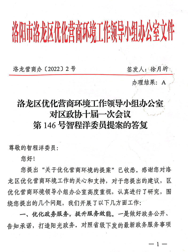 洛龍區(qū)優(yōu)化營商環(huán)境工作領(lǐng)導(dǎo)小組辦公室對區(qū)政協(xié)十屆一次會議第146號智程洋委員提案的答復(fù)