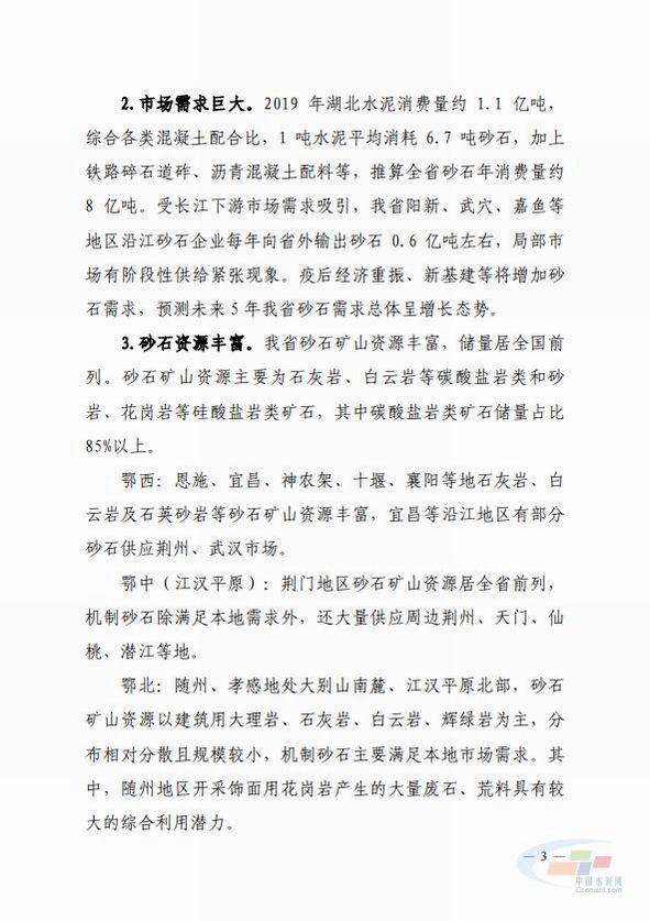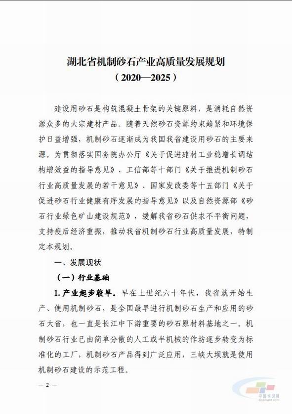 近期,湖北省工信廳印發(fā)了關(guān)于《湖北省機(jī)制砂石產(chǎn)業(yè)高質(zhì)量發(fā)展規(guī)劃(2020-2025)》的通知。據(jù)悉,疫情經(jīng)濟(jì)重振、新基建等將增加砂石需求,預(yù)測(cè)未來5年湖北省砂石需求總體呈增長態(tài)勢(shì)。目標(biāo)到2025年,全省機(jī)制砂石年產(chǎn)能達(dá)到9.9億噸以上,其中機(jī)制砂年產(chǎn)能4億噸以上,實(shí)現(xiàn)湖北省砂石產(chǎn)業(yè)可持續(xù)發(fā)展。
