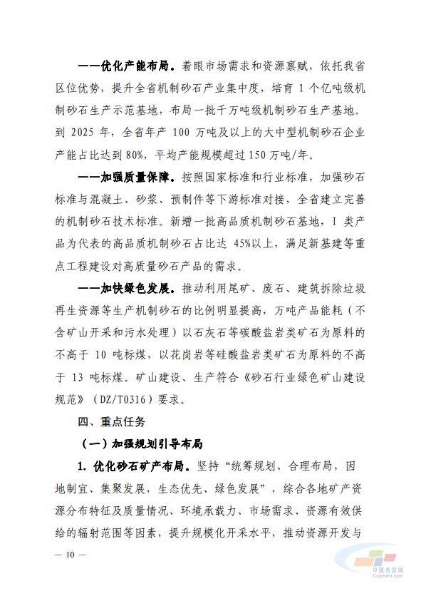 《方案》要求,到2025年基本建立布局科學(xué)、產(chǎn)業(yè)鏈協(xié)同發(fā)展、供需基本平衡的砂石供應(yīng)保障體系,年產(chǎn)1000萬噸及以上的機(jī)制砂石企業(yè)產(chǎn)能占比達(dá)到40%,力爭(zhēng)培育6家以上智能化、綠色化、質(zhì)量高、管理好的企業(yè)。對(duì)此,《方案》提出了建立部門工作協(xié)作機(jī)制、落實(shí)屬地責(zé)任、營造良好環(huán)境三大保障措施,以及七大重點(diǎn)舉措。