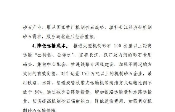 降低運(yùn)輸成本。完善水運(yùn)網(wǎng)絡(luò)和港口集疏體系建設(shè),加快推進(jìn)布局砂石集散中心和鐵路專用線建設(shè);對(duì)年運(yùn)量150萬噸以上的機(jī)制砂石企業(yè),根據(jù)企業(yè)需要,按規(guī)定建設(shè)鐵路專用線。